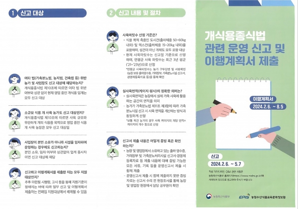식용을 위해 개를 사육하는 농장주 및 도살·유통하거나 식용을 목적으로 개를 원료로 사용해 만든 식품을 유통·판매하는 자는 5월 7일까지 증빙자료와 함께 운영신고서를 작성·제출해야 하며 8월 5일까지 전·폐업 이행계획서를 제출해야 한다.