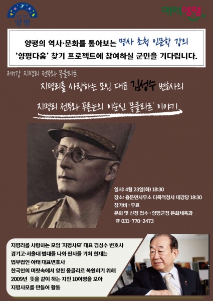 첫 번째 강연자는 ‘지평리를 사랑하는 모임’의 대표 김성수 변호사로 ‘지평리 전투와 몽클라르’를 주제로 용문 다목적 청사 대강당에서 포문을 연다.