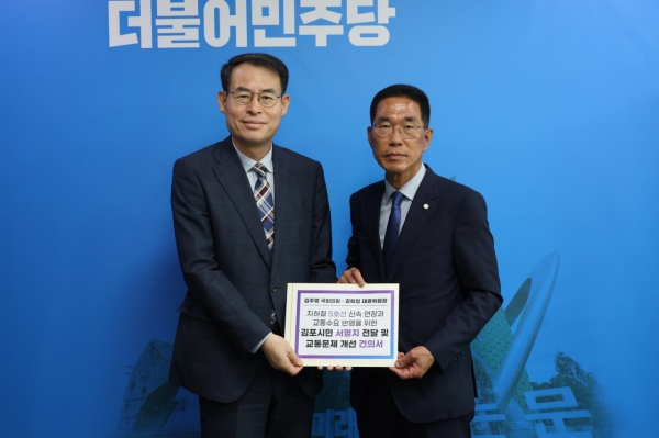 김주영 의원은 ‘5호선 연장 예타 면제, 김포경찰서역·풍무2역 추가 정거장 신설, 감정역 평면환승 확정 추진’ 내용을 담은 김포 교통개선 건의서를 김포시민의 서명지와 함께 전달했다.