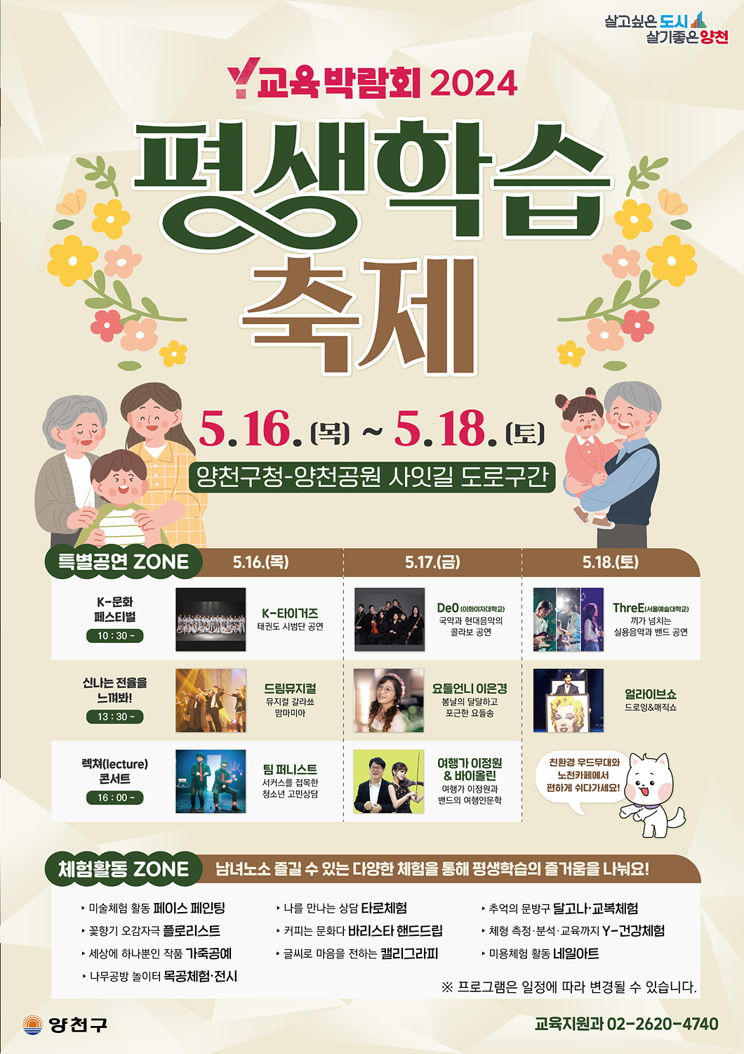 ‘Y교육박람회 2024’의 한 축을 담당할 이번 축제는 기존 일방향 강의, 수강생 발표 중심의 형식을 벗어나, 모든 세대가 함께 즐기는 참여 · 체험형 코너를 통해 삶을 관통하는 평생학습의 의미를 되새겨 볼 수 있는 공연융합형 특강(렉쳐 콘서트), 이색 체험부스, 문화 · 예술 공연 등 다채로운 프로그램으로 구성됐다.
