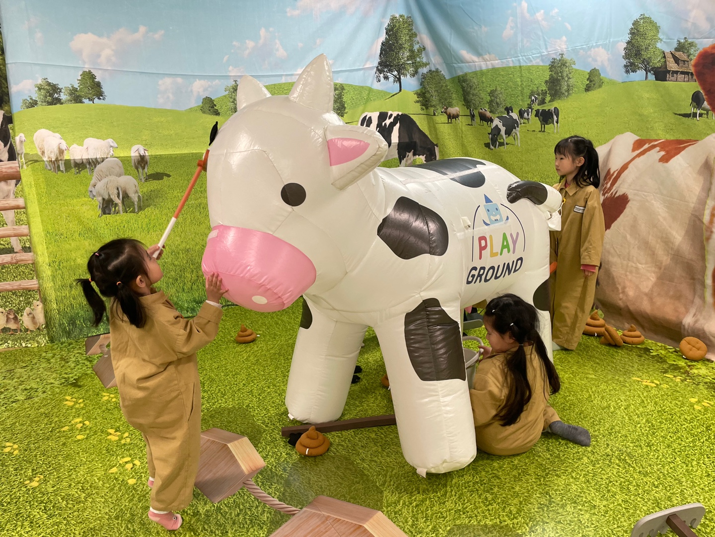 이후 유아들은 동물농장 주인 옷으로 갈아입은 뒤 초대형 젖소에게 먹이도 주고 먼지도 깨끗하게 씻겨주는 놀이를 하였다. 젖소가 눈 똥을 수레로 옮겨주는 게임에도 즐겁게 참여해보면서 동물 농장에서 할 수 있는 일에 대해 경험해볼 수 있었다. 양계장으로 이동한 뒤 계란 모형을 찾아 파이프에 굴려도 보고 깨끗해진 계란을 통에 담아 마트로 배달해주는 경험을 통해 계란의 유통 과정을 알아볼 수 있었다.