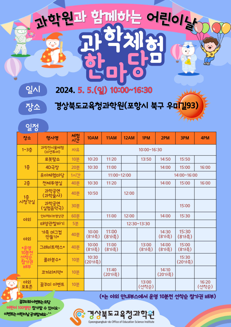 ■ 경상북도교육청과학원(포항시 북구 우미길 93)에서는 어린이날을 맞아 5월 5일(일) 10시부터‘즐거운 과학 놀이터에서 놀자’라는 주제로 온 가족이 함께 즐길 수 있는 특별한 과학체험 활동의 장을 마련한다고 밝혔다.