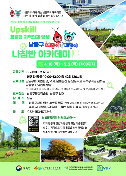 [금요저널] 인천시 남동구는 다음 달 2일까지 남동형 지역학 강사 양성 프로그램인 ‘Upskill 로컬형 지역인재 양성 남동구 새랑이&게랑이 나침반 아카데미’학습자를 모집한다고 29일 밝혔다.