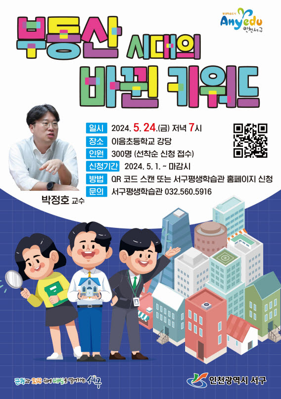 [금요저널] 인천 서구는 오는 5월 24일 저녁 7시, 현장 중심의 실사구시형 경제학자인 박정호 교수를 초청해 ‘부동산 시대의 바뀐 키워드’라는 주제로 제81회 명사 초청 서구아카데미를 진행한다고 밝혔다.