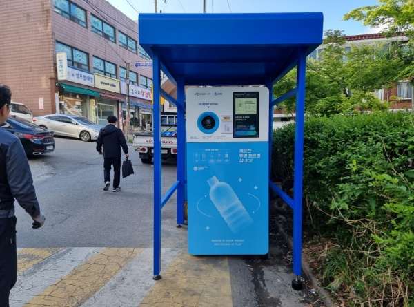 ‘AI 무인수거기’는 사물인터넷 기술을 적용한 기기로 라벨이 제거된 투명페트병을 자동 인식·분류·압착해 수거하는 자판기 형태의 비대면 수거기이다.