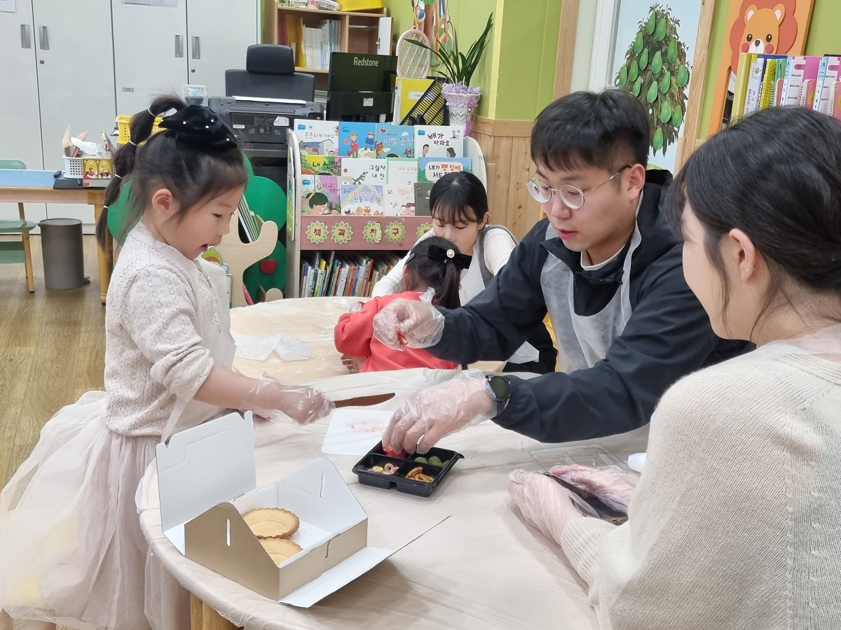 ◇ 보호자 참여수업은 <프랑스로 떠나요~ 과일 타르트!!>라는 놀이로 보호자와 유아들이 다양한 요리 재료를 이용해 과일 타르트를 만들어 보며 다른 나라의 문화에 대해 함께 체험해보는 시간을 가졌다.