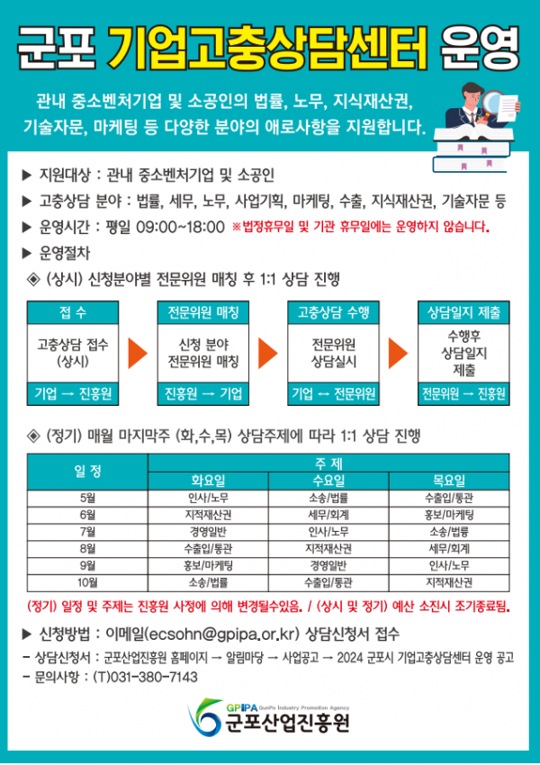 기업고충상담센터는 상시 운영으로 군포산업진흥원 홈페이지 공고문 확인 후 이메일 및 아래 링크를 통해 신청이 가능하다.