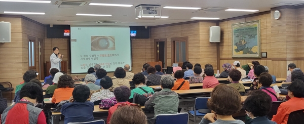 이 원장은 눈의 구조와 시각 경로에 대한 강의를 시작으로 3대 노인성 안질환인 백내장과 녹내장, 황반변성 등 각 안질환의 증상과 질환이 생기는 원인 그에 따른 치료 및 예방법 등을 설명했다.