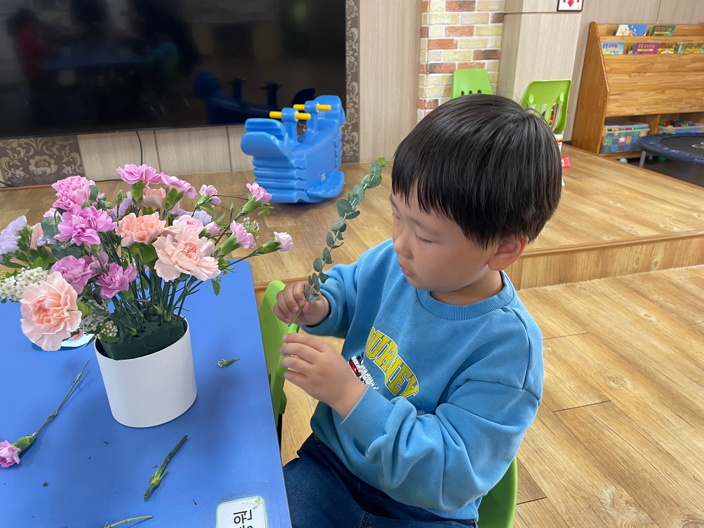 이후 유아들은 기뻐하실 부모님을 생각하며 오아시스에 원하는 색상의 꽃들을 꽂아보았다. 키 큰 꽃들은 줄기를 잘라서 꽂아야하는 것도 스스로 터득해보며 바구니에 점차 꽃들로 가득차기 시작하였다. 중간 중간에 들꽃으로 꾸며도 보면서 나만의 카네이션 바구니를 완성해보았다.