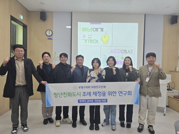 조례 제정을 기점으로 부서와 협업해 본격적으로 청년친화도시 지정을 위한 사업을 구상 및 추진하고 있다”고 언급하며“부평구의회의 청년친화도시 조성을 위한 연구모임의 성공을 기원하며 담당부서와 긴밀한 협조 및 원활한 소통을 통해 우리 서구와 함께 청년친화도시로 지정되기를 응원한다”고 밝혔다.