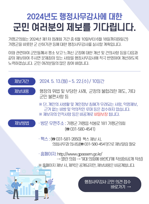 [금요저널] 가평군의회가 2024년도 행정사무감사를 앞두고 5월 13일부터 22일까지 총 10일간 군정 개선 사항 등에 대한 군민들의 제보를 받는다고 밝혔다.