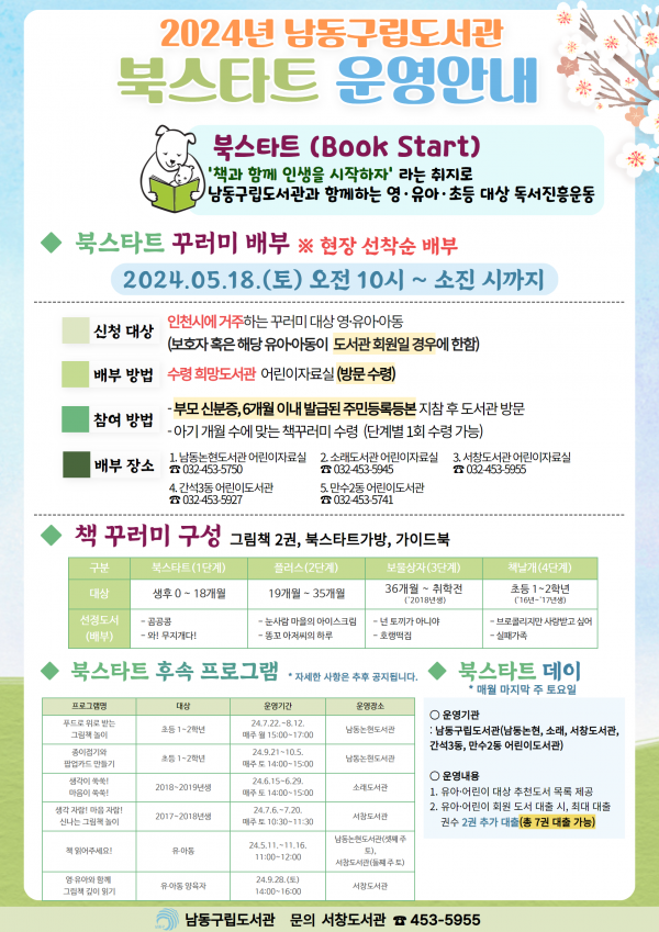 [금요저널] 인천시 남동구립도서관은 오는 18일 오전 10시부터 ‘2024 북스타트 책 꾸러미’ 배부한다고 13일 밝혔다.