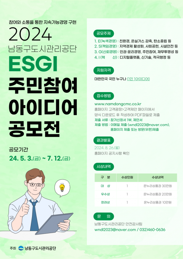 [금요저널] 인천시 남동구 도시관리공단은 ‘2024년 ESGI 주민참여 아이디어 공모전’을 연다고 13일 밝혔다.
