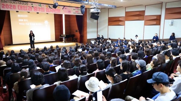 2028학년도 대입제도 개편안이 적용되는 중학교 학부모를 대상으로 한 이번 강연은 윤여정 입시전문가의 강의로 진행됐으며 강연장에는 200여명의 학부모가 참석해 자리를 가득 메웠다.