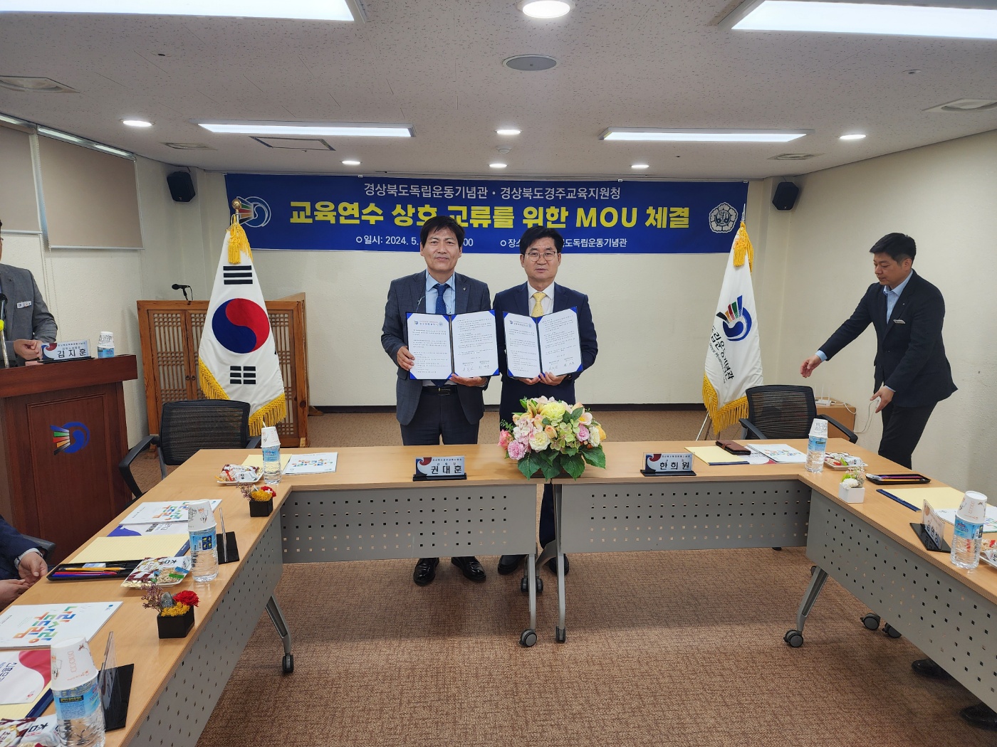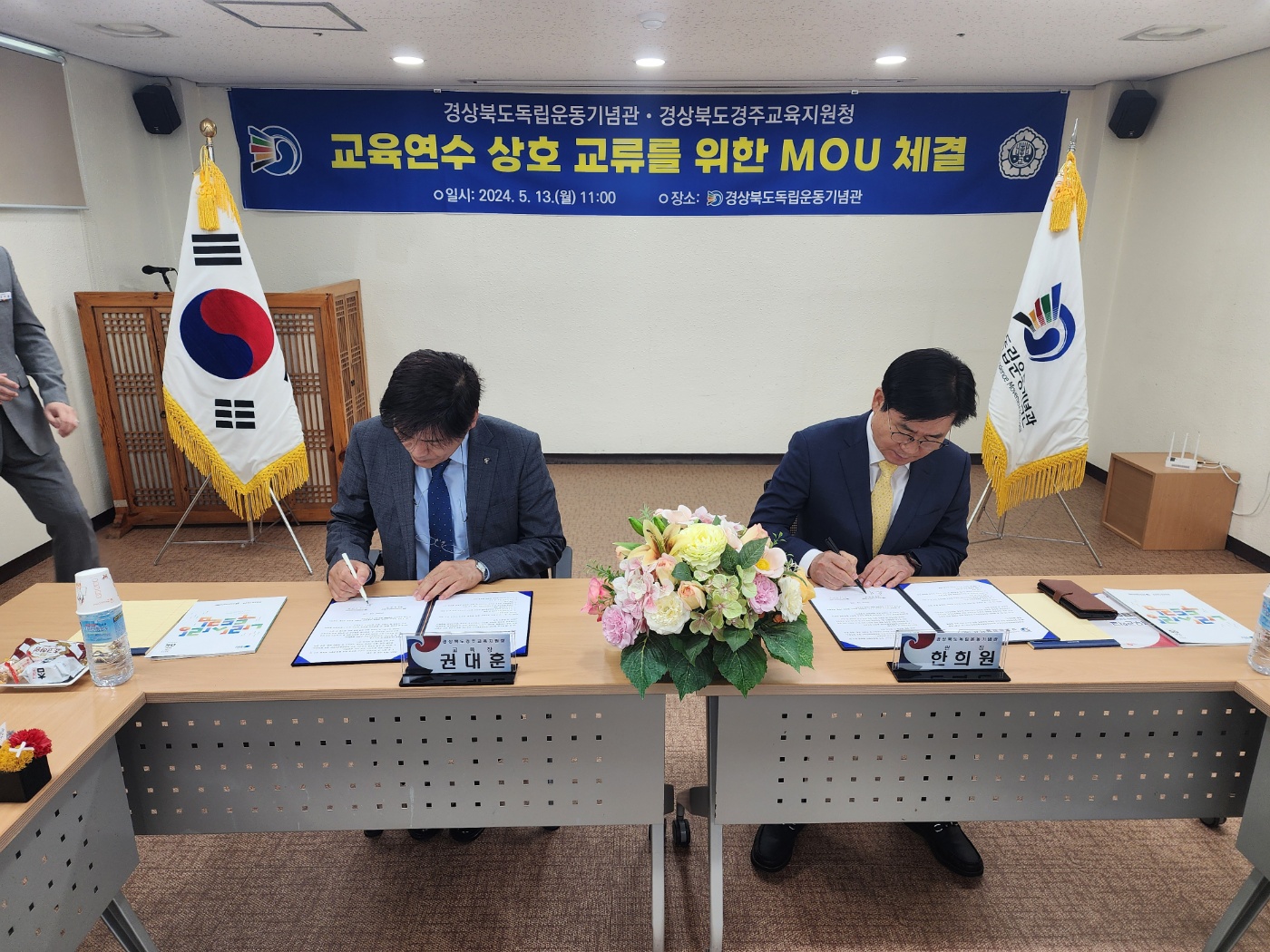 경상북도경주교육지원청(교육장 권대훈)은 5월 13일(월) 경상북도독립운동기념관 국민 대표 회의실에서 경상북도독립운동기념관 한희원 과장 외 6명, 경상북도경주교육지원청 권대훈 교육장 외 4명이 참석하여 업무협약을 체결하였다.