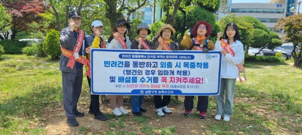 이번 행사는 반려동물 등록, 배설물 즉시 수거, 외출 시 목줄 착용 안내와 지난 4월 동물보호법 개정으로 강화된 맹견관리 방안과 공동주택 내부 공용공간의 범위 확대로 인한 반려견 안전관리에 대한 홍보를 중점 실시했다.