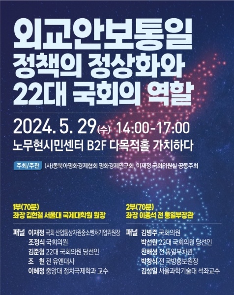 [금요저널] 국회 산업통상자원중소벤처기업위원회 이재정 위원장이 5월 29일 오후2시 노무현시민센터 다목적홀에서 ‘외교·안보·통일 정책의 정상화와 22대 국회의 역할’에 대한 좌담회를 개최한다고 밝혔다.