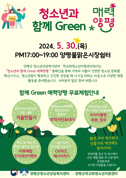 [금요저널] 양평군청소년상담복지센터와 양평군학교밖청소년지원센터는 오는 30일 양평물맑은시장 쉼터 일대에서 ‘청소년과 함께Green 매력양평’ 캠페인을 진행한다고 밝혔다.