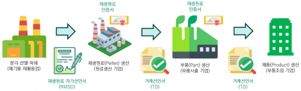 재생원료 인증제도는 원료부터 소재, 부품 및 최종재에 이르는 제품 공급망의 전 과정을 추적해 재생원료 사용 여부와 함유율을 인증하는 제도이다.