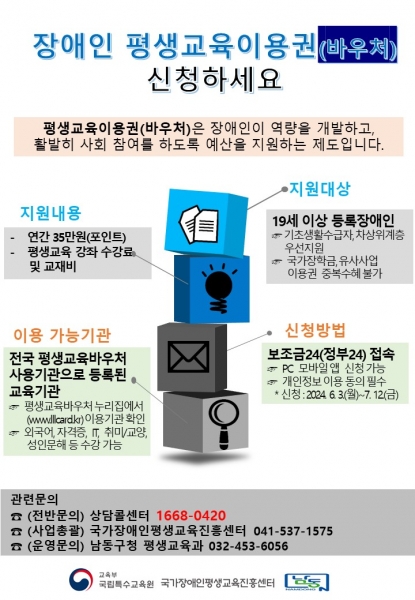 ‘남동형 장애인 평생교육이용권 지원사업’은 6월 3일부터 7월 12일까지 ‘보조금 24’를 통해 신청받는다.