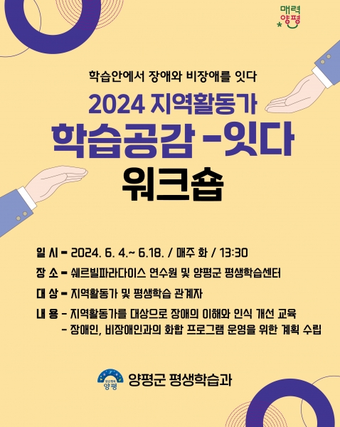 [금요저널] 양평군은 지역 중심의 장애인 평생교육 기반 조성을 위해 장애와 비장애를 학습으로 잇는 ‘학습공감-잇다’ 워크숍을 개최한다고 3일 밝혔다.