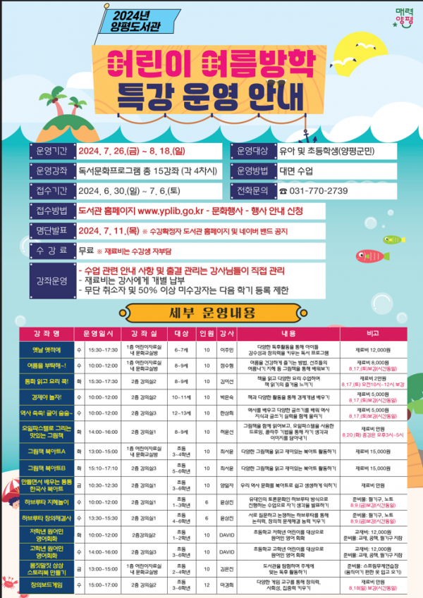 [금요저널] 양평군이 30일부터 다음달 6일까지 유아, 초등학생을 대상으로 양평도서관에서 진행하는 ‘여름방학 특강’ 수강생을 모집한다.