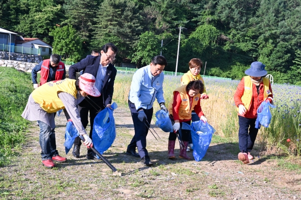 [금요저널] 전진선 양평군수가 5일 오전 7시, 아름다운 청운면 밀밭 일대에서 군 공무원, 청운면 15개 기관·단체장, 회원 등 약 200여명과 함께 ‘제2회 양평 밀 축제’ 손님 맞이 대청소에 나섰다.