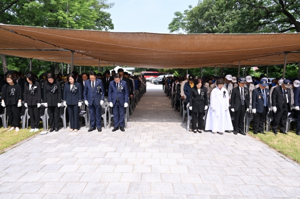 추념식은 오전 10시 정각 사이렌 취명에 맞춰 1분간 묵념으로 시작해 △국기에 대한 경례 △헌화와 분향 △헌시낭독 △추념사 △현충의 노래제창 순으로 진행됐다.