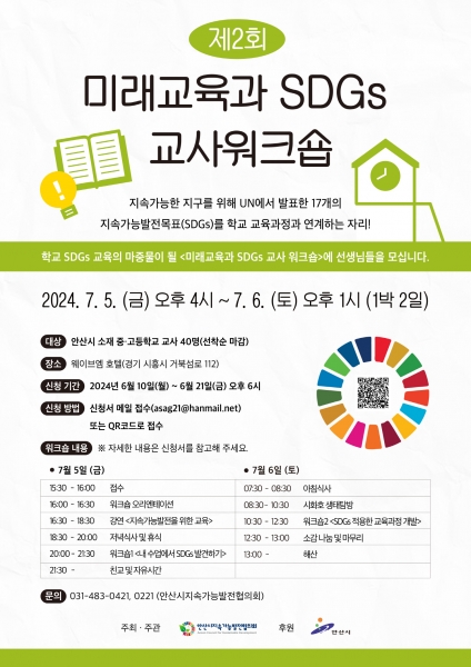 [금요저널] 안산시는 다음 달 5일부터 6일까지 1박 2일간 시흥시 소재 웨이브엠 호텔에서 지속가능발전목표와 학교 교육과정을 연계하는 ‘미래교육과 SDGs 교사 워크숍’을 개최한다고 13일 밝혔다.