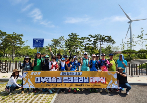 이번 투어 기간 참가자들은 △해송숲과 낙조 전망대가 있는 1코스 △해안가 갯벌로 어우러진 2코스 △끝없이 이어지는 광활한 해안가 3, 4코스 △염전의 풍경을 볼 수 있는 5코스 △세계 5대 서해안 갯벌과 낙조가 아름다운 6코스 △자전거 트레킹 코스로 적합한 7-1코스 등 대부해솔길 전체 구간을 대상으로 산악달리기를 진행했다.