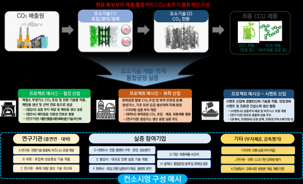 해당 전략의 일환으로 추진되는 ‘CCU 메가 프로젝트’는 ➊연구개발 주체는 물론, ➋이산화탄소 발생원이 존재하는 수요기업, ➌CCU 제품 활용 기업, ➍감축량 평가·검증 기관 등이 모두 참여하는 컨소시엄 형태로 이산화탄소 공급부터 제품 활용까지 이산화탄소 포집·활용 전주기 밸류체인을 구성해 CCU 비즈니스 모델을 확보하는 것을 목표로 대규모 실증을 지원하는 사업이다.