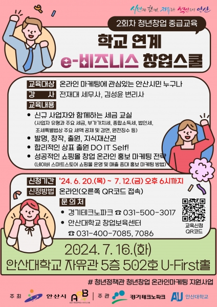 [금요저널] 안산시는 관내 고등학생 및 대학생, 청년 등을 대상으로 ‘2024년 안산시 학교 연계 e-비즈니스 창업스쿨 2회차 청년 창업 중급교육’ 수강생을 모집한다고 20일 밝혔다.