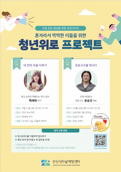 이번 강연 신청은 포스터의 QR코드 또는 안산시자살예방센터 전화로 150명 사전 접수하며 안산시민이 아니어도 누구나 참여할 수 있다.