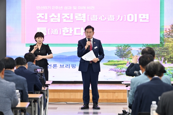 [금요저널] “진심진력으로 군민과 소통하며 달려온 2년, 후반기에도 사람과 자연이 함께 행복한 양평을 향해 힘차게 전진한다” 전진선 양평군수가 1일 민선8기 취임 2주년을 맞아 군청 대회의실에서 기자회견을 열고 전반기 성과와 후반기 변화될 군정 운영 방향을 설명했다.