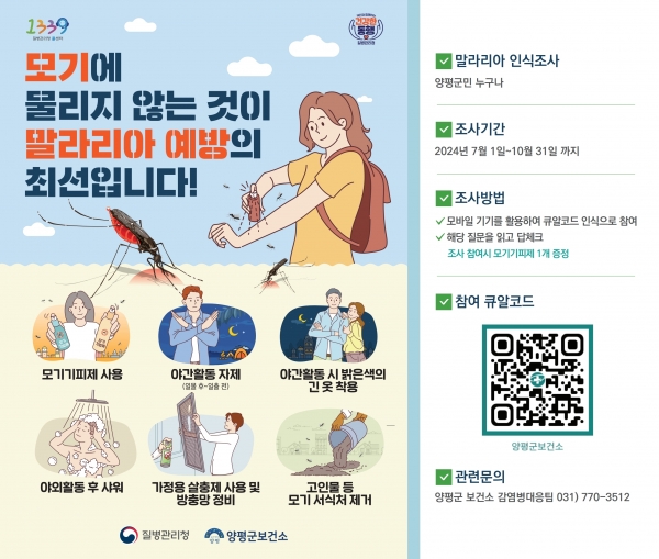 배명석 보건소장은 “모기에 물리지 않도록 예방수칙을 준수해 말라리아 감염병을 예방하고 건강을 지키시길 바란다”며 “말라리아 인식조사는 보건소 홈페이지 또는 양평군 누리 소통망 서비스, 보건소 방문을 통해 참여가 가능하며 보건소 방문자에 한해 모기 기피제를 배부하니 많은 참여를 부탁드린다”고 전했다.