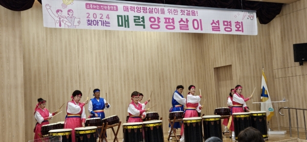 본격적인 설명에 앞서 양평군 어울림공동체 지원사업에 참여하고 있는 도곡리 ‘고래실 난타팀’의 신나는 난타 공연과 양수2리 시니어댄스팀의 멋진 무대가 이목을 끌었다.