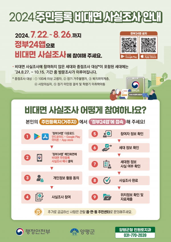 [금요저널] 양평군이 군민을 대상으로 7월 22일부터 10월 15일까지 ‘2024년 주민등록 사실조사’를 실시한다.