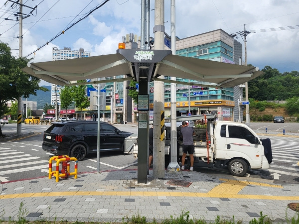 또한, 스마트그늘막은 횡단보도 등 보행자 이동이 많은 구간 내 신호대기 시 쉴 수 있도록 보행편의 시설물로 음성 신호안내, 기상상황에 따라 자동으로 펼쳐지고 접히는 시설물이다.