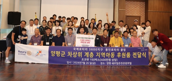[금요저널] 국제로타리 3600지구 용인로타리클럽이 지난 26일 하계 단합 가족 합동 야외주회를 개최하고 양평군 차상위계층 지역 아동을 위해 고급 초콜릿 약 150개를 전달했다.
