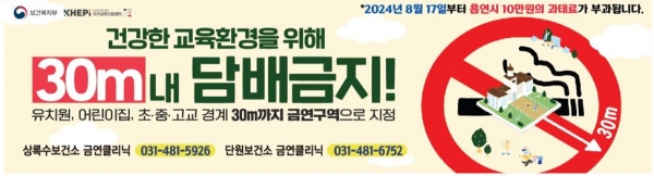 기존에는 어린이집·유치원 시설 경계 10m 이내가 금연구역으로 지정됐지만, 이번 국민건강증진법 개정으로 초·중등교육법에 따른 학교시설까지 포함해 그 경계선으로부터 30m 이내까지 금연 구역으로 확대된다.