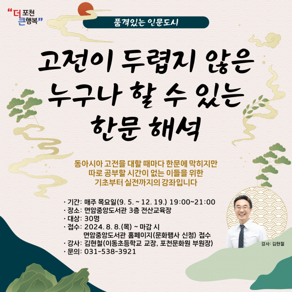 [금요저널] 포천시는 고전을 읽고 싶어도 한문 때문에 어려움을 겪는 시민들을 위해 ‘누구나 할 수 있는 한문 해석’ 강좌를 운영한다.