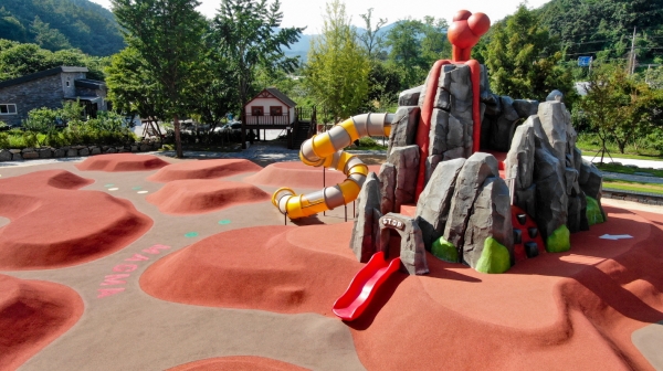 한탄강세계지질공원센터 야외에 약 1,000평 규모로 조성된 ‘한탄강화산놀이터’는 화산이 폭발해 마그마가 흘러내리는 모습을 실감나게 구현한 어린이 놀이시설로 별도의 요금 없이 무료로 이용할 수 있다.