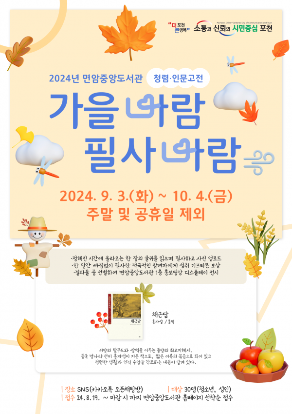 [금요저널] 포천시는 오는 9월 3일부터 10월 4일까지 면암중앙도서관에서 청렴 인문 고전 도서를 주제로 ‘가을 바람, 필사 바람’ 프로그램을 운영한다.