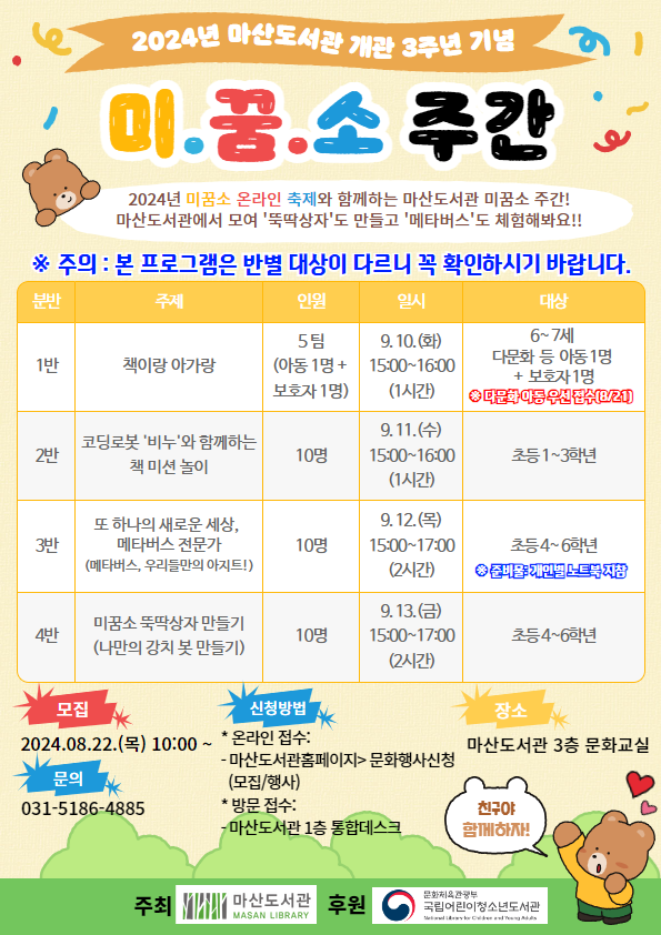 ‘미꿈소’는 국립어린이청소년도서관의 창작 공간인 ‘미래 꿈 희망 창작소’의 줄임말로 4차 산업혁명 시대를 이끌어갈 어린이, 청소년들에게 미래의 인재가 될 수 있도록 전국 도서관 등에 다양한 프로그램과 관련 메이커 기기를 제공하는 창작 공간 지원 사업이며 2024년 경기도에서 유일하게 마산도서관이 선정되어 지난 7월 첫 프로그램을 시작으로 운영 중에 있다.