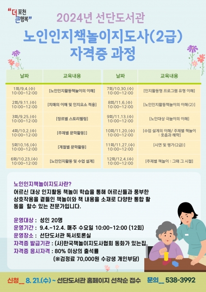[금요저널] 포천시는 선단도서관에서 지역 어르신들의 삶의 질 향상과 독서문화 활동을 돕기 위한 노인인지책놀이지도사 자격증 과정을 운영한다고 밝혔다.