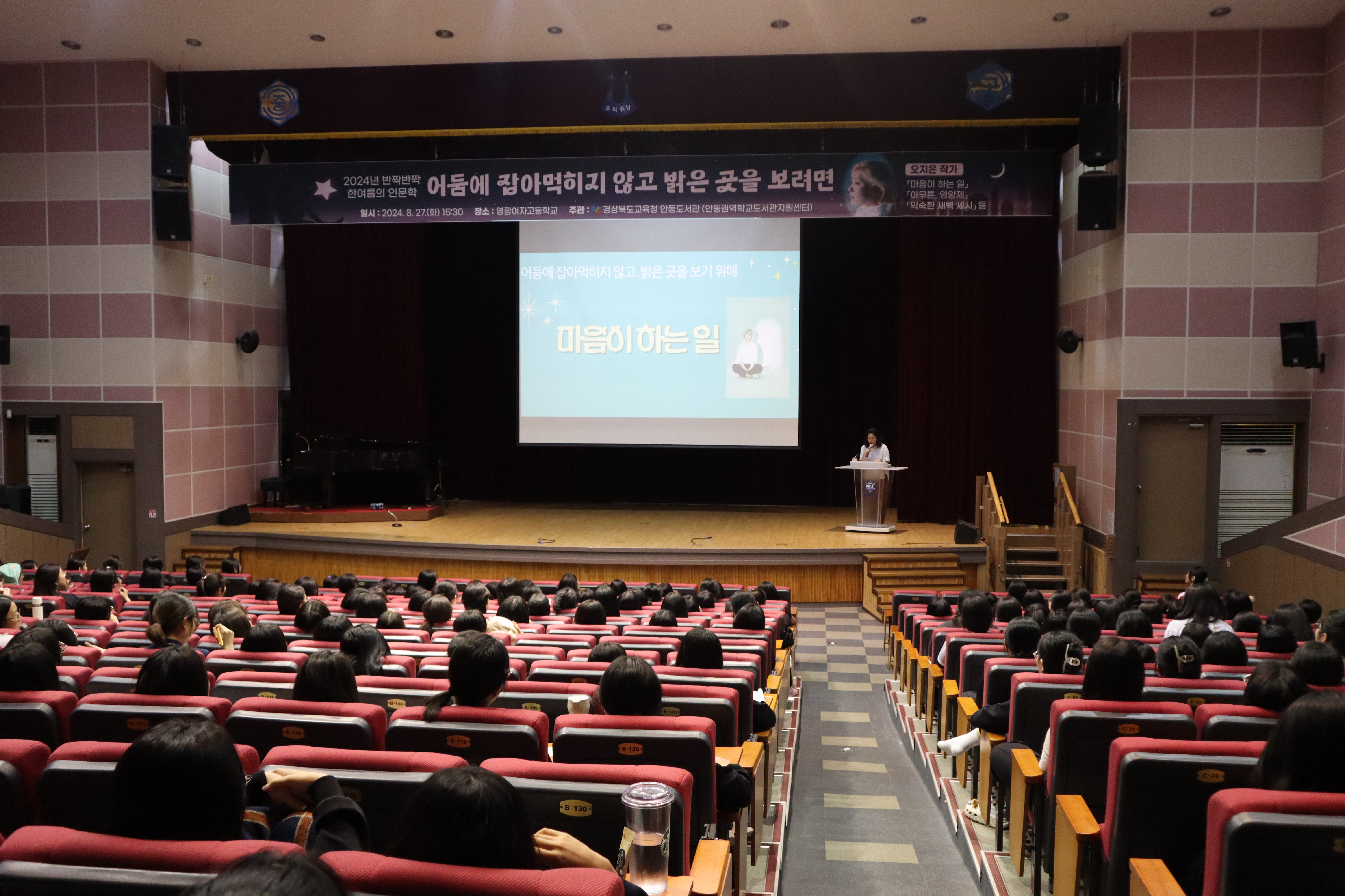 □ 경상북도교육청 안동도서관(관장 박용조)은 지난 8월 27일(화), 영주 영광여자고등학교 학생 300명을 대상으로‘마음이 하는 일’의 저자 오지은 작가를 초청하여 ‘어둠에 잡아먹히지 않고 밝은 곳을 보려면’이라는 주제로 특강을 진행했다.