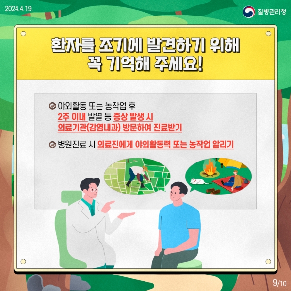 진드기 매개 감염병 예방 수칙으로는 △야외 활동 때 노출 없는 긴 옷 착용 △진드기 기피제 사용 △등산로 벗어난 산길 및 풀숲 피하기 △야외 활동 후 샤워 및 옷 털기 △진드기 물린 흔적이나 의심 증상 살피기 등이 있다.