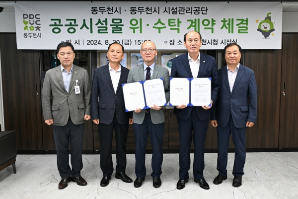 [금요저널] 동두천시는 지난달 30일 시장실에서 박형덕 동두천시장과 이종진 동두천시 시설관리공단 이사장 등 5명이 참석한 가운데 공공시설물 위수탁 계약 체결식을 개최했다.