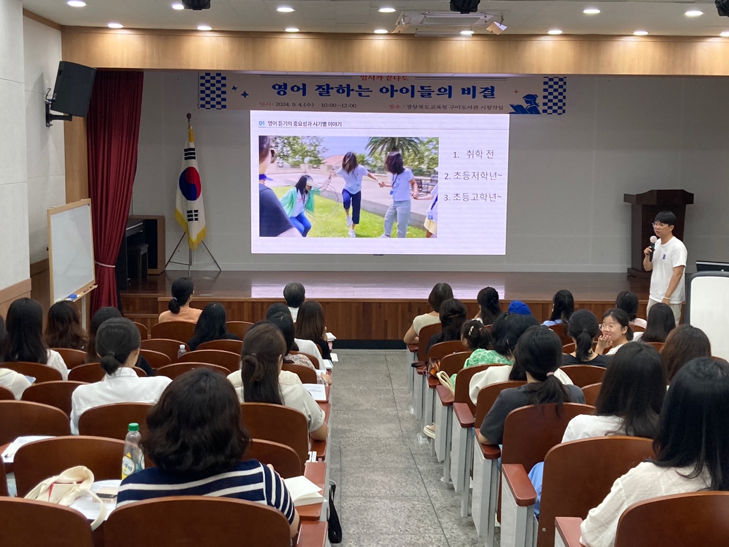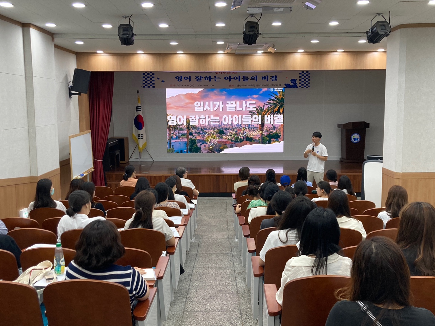 □ 경상북도교육청 구미도서관(관장 최선지)은 오늘 9월 4일 오전 10시 자녀 영어교육에 관심이 많은 학부모 60명을 대상으로 ‘입시가 끝나도 영어 잘하는 아이들의 비결’을 주제로 허준석 강사를 초빙하여 특강을 진행했다고 밝혔다.