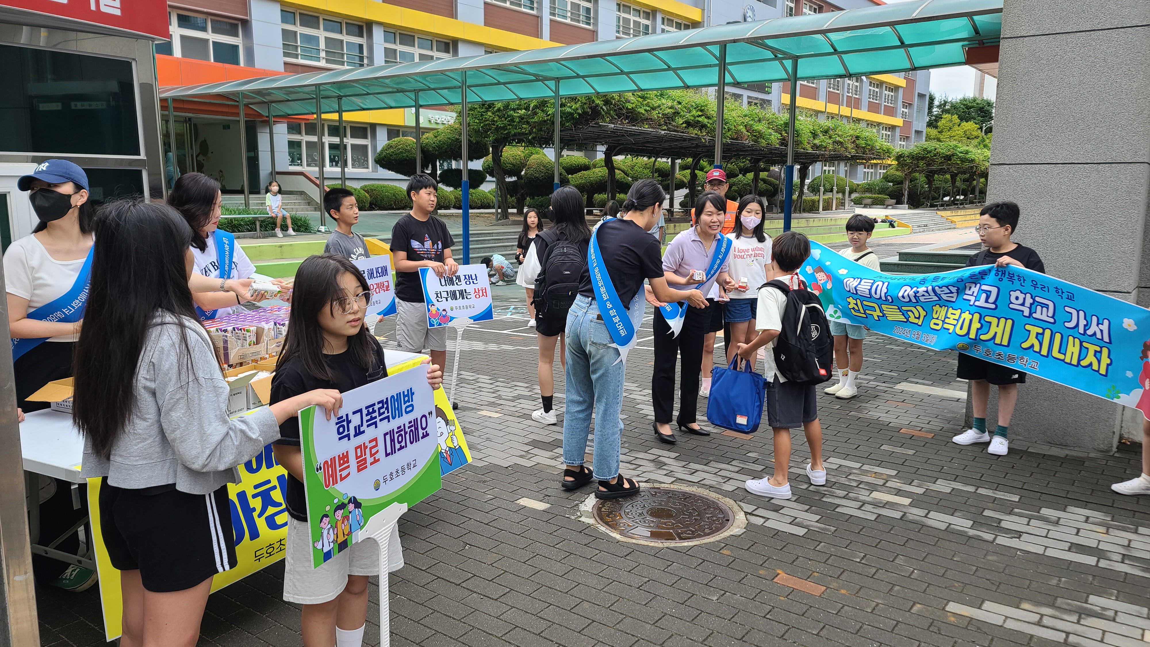 ▣ 본교 학부모회와 학생회는 학생과 교직원들의 등굣길을 맞이하며 떡과 음료를 나누어 주며 아침밥을 꼭 챙겨먹고 건강한 몸과 마음으로 친구들과 학교폭력 없이 행복한 학교를 만들 것을 당부하였다. 또한 포항북부경찰서 소속 본교 학교전담경찰관(SPO)도 함께 참석하여 학생들의 언어문화를 개선하고, 학교폭력을 예방하는 캠페인에 앞장섰다.